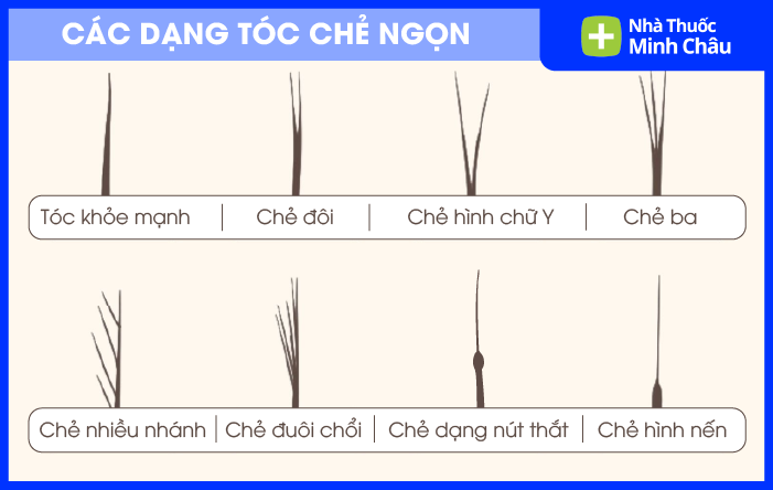 Ngọn tóc tách đôi hoặc nhiều nhánh: Thay vì sợi tóc liền mạch, phần đuôi tách làm 2–3 nhánh nhỏ.